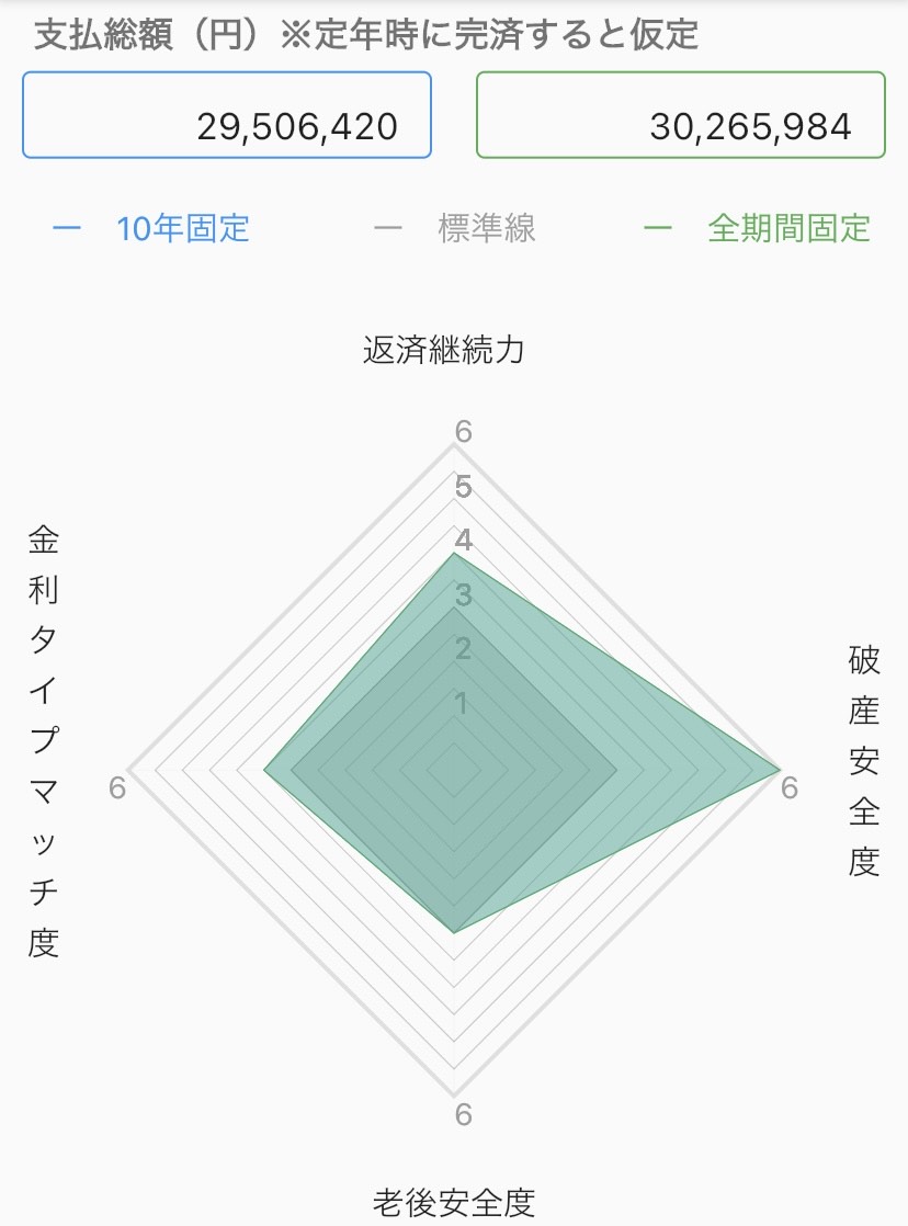金利タイプマッチ度では変動金利よりも全期間固定金利がマッチするという結果になりました。変動金利では、手取り月収に対して毎月返済額の余裕がないので金利上昇に対応することは難しいでしょう。また、完済を目指す定年の65歳まであと20年以上あります。変動金利を選ぶと長期間にわたり金利変動リスクにさらされるとも言えます。